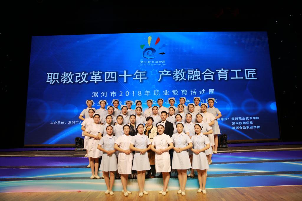 在职教周活动启动仪式上,着重展示我校百年发展历史、“一带一路”国际交流合作成果、创新创业成果等,护理系学生表演“护理礼仪”,充分展示了白衣天使的风采和严谨的职业精神。